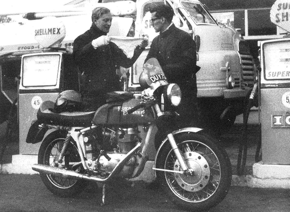 Royal Enfield recruited a team of five riders, including Patrick, for the venture (above). His stint took him from Carlisle, Cumbria to Penkridge in the West Midlands, calling in at Oulton Park racing circuit where the legendary Geoff Duke was scheduled to take the bike to the limits of roadholding and performance on the track. That part of the proceedings was, quite literally put on ice, however, when the sinuous circuit was liberally coated with frost.